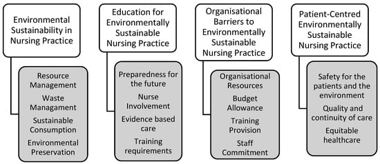 The results from five of the open-ended survey questions were coded and grouped into four overarching themes. These were (1) Environmental Sustainability in Nursing Practice; (2) Education for Environmentally Sustainable Nursing Practice; (3) Organisational Barriers to Environmentally Sustainable Nursing Practice; and (4) Patient-Centred Environmentally Sustainable Nursing Practice. Figure 4 illustrates the four themes identified in this data set alongside the codes that informed them.