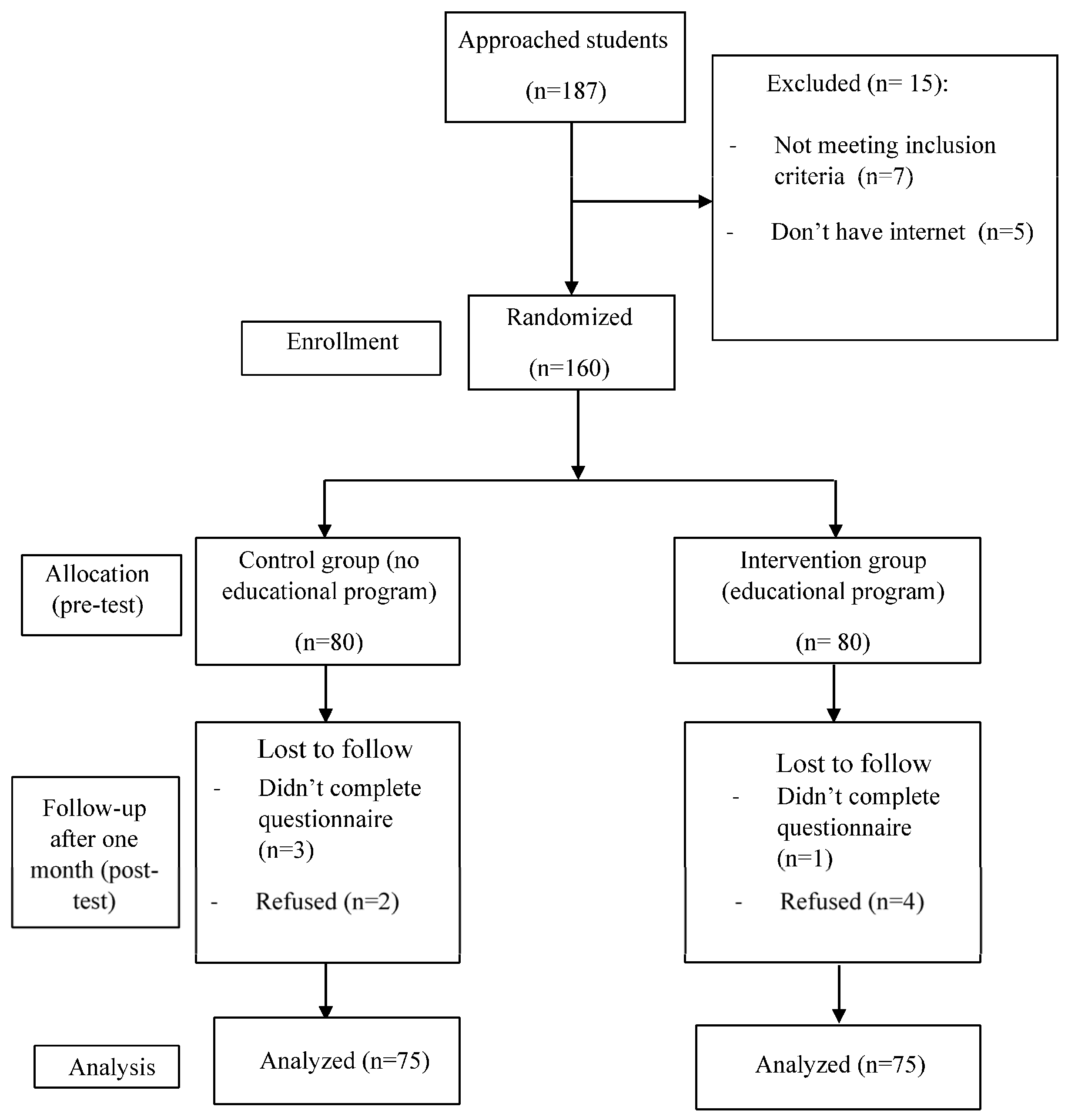 | - Female | 56 (74.7) | 57 (76.0) | 113 (75.3) | |||