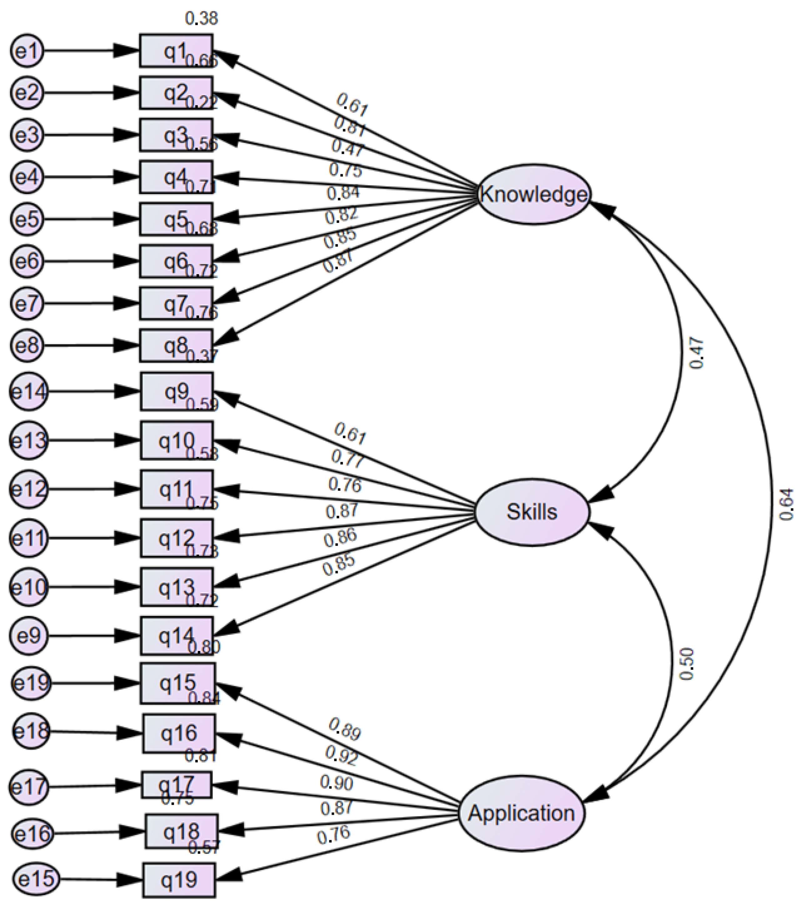 Statistical analyses were conducted via IBM SPSS Statistics, version 28.0, for Windows. Data analyses include descriptive statistics, assessment of the RCAIN psychometric properties (i.e., reliability and validity), comparisons of nurse research competencies among groups based on their demographics (i.e., independent t-test or non-parametric Mann–Whitney U test, and ANOVA), and correlations among the RCAIN subscales. Descriptive statistics summarize demographic and clinical characteristics. Categorical variables are presented as absolute (n) and relative frequencies (%). Continuous variables are reported as means with Standard Deviations (SD), medians with Interquartile Ranges (IQR), or means with 95% Confidence Intervals (CI), depending on the variable distribution. The Kolmogorov–Smirnov test and histograms were used to assess normality. Cronbach’s alpha coefficients were calculated to assess internal consistency reliability for each of the three RCAIN sections. To assess the construct validity of the questionnaire, a Confirmatory Factor Analysis (CFA) was conducted, during which the following indices were calculated: χ2/df, Root Mean Square Error of Approximation (RMSEA), Goodness of Fit Index (GFI), Adjusted Goodness of Fit Index (AGFI), Tucker–Lewis Index (TLI), Incremental Fit Index (IFI), Normed Fit Index (NFI), and Comparative Fit Index (CFI). According to the literature, the acceptable thresholds for these indices should be as follows: χ2/df < 5, RMSEA < 0.10, and GFI, AGFI, TLI, IFI, NFI, CFI > 0.90. Thresholds indicating a very good model fit should be: χ2/df < 3, RMSEA < 0.08, and GFI, AGFI, TLI, IFI, NFI, CFI > 0.95. Group comparisons among subgroups were performed using either the independent samples t-test or the non-parametric Mann–Whitney U test, depending on data distribution. For comparisons involving more than two groups, Analysis of Variance (ANOVA) or the non-parametric Kruskal–Wallis test was applied. Correlations between continuous variables were assessed using Pearson’s or Spearman’s rho, based on data normality. Homogeneity of variances was evaluated using Levene’s test, and Bonferroni correction was applied to adjust for multiple comparisons among subgroups. Statistical significance was set at p = 0.05.