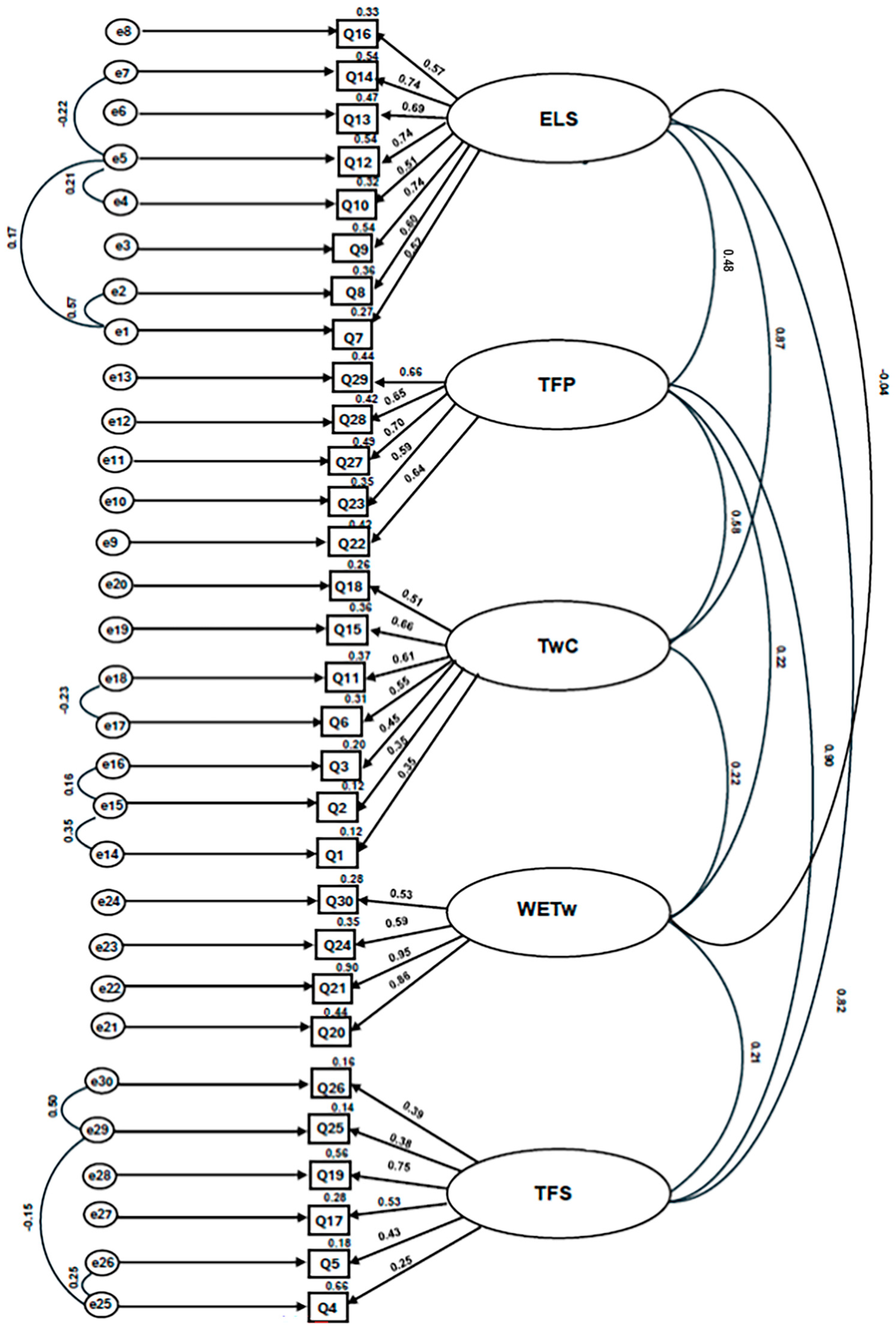 - The overall model fit quality was analyzed using several indices, which are considered improvable due to being marginal [45]. To adjust the model, pairs of error covariances between items were analyzed. The following pairs of covariances were corrected, with the following modification indices: e1-e2 (50.195), e1-e5 (6.738), e4-e5 (6.508), e5-e7 (7.032); e14-e15 (20.888), e15-e16 (5.840), e17-e18 (6.006); e23-e24 (25.373); e25-e26 (10.219), e25-e29 (6.333), e29-e30 (40.997). According to Marôco [45] these corrections should be made up to a value of 6 in the covariance modification indices. The minimum value we obtained was 5.840, which we still corrected because it was very close to 6 and to obtain better values in the adjustment of the final factorial model. Thus, eleven covariance corrections were performed, resulting in an improvement in the global fit indices. An overall acceptable model fit was obtained, with adequate incremental fit indices and marginal absolute fit indices: CMIN/DF =1.461 (≤3); RMR = 0.044 (≤0.05); GFI = 0.821 (≥0.90); AGFI = 0.783 (≥0.90); Delta2 = 0.903 (≥0.90); CFI = 0.900 (≥0.90); SRMR = 0.0748 (≤0.08); RMSEA = 0.054 (≤0.05) e MECVI = 4.731 (<5).