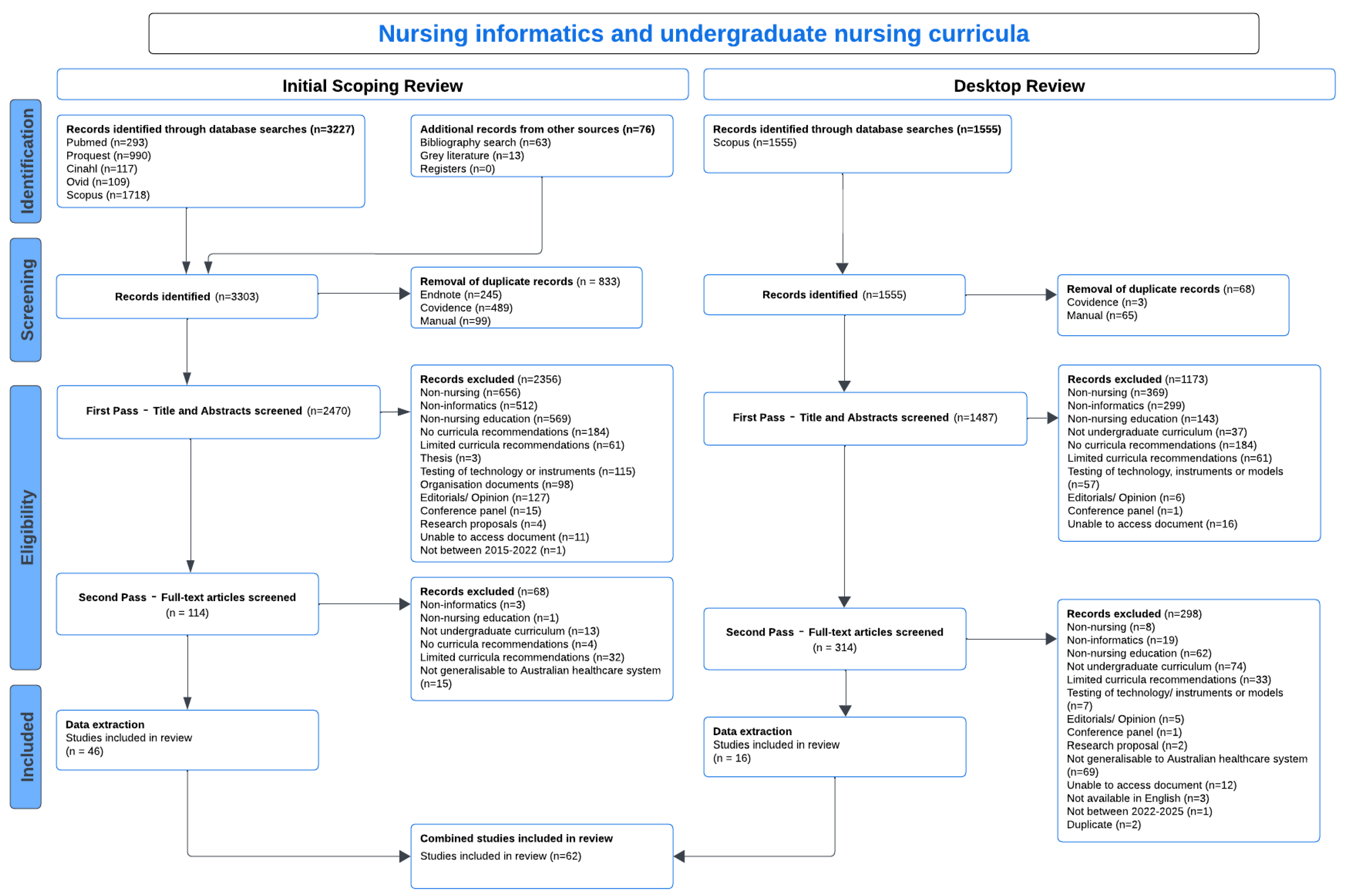 | Exclusion Criteria | Scoping Review Total Articles n = 3303 | Subsequent Desktop Review Total Articles n = 1555 | Total Sources Excluded (n = 3895) |