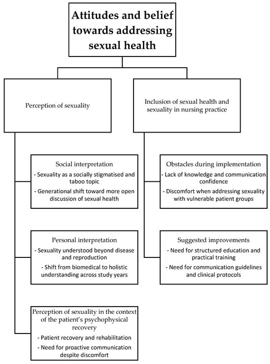 The shift from a biomedical to a more holistic approach to patient care was evident across the years of study. Second-year students described sexuality and health primarily in terms of body-related satisfaction and self-expression: “For me, sexuality means feeling good in my own body and being able to express myself.” Third-year students focused on relationships and sexual orientation in the context of identity development: “At this stage, sexuality is about relationships between men and women and about discovering your own sexual identity.” Fourth-year students emphasised psychological and physiological needs and individual experience: “Sexuality is a psychological and physical need, and it plays a role in recovery; everyone experiences it differently.” Master’s students highlighted personal preferences and sexual enjoyment: “Sexuality also includes personal preferences and sexual enjoyment.”
