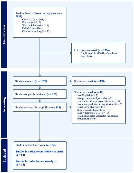 To address these gaps, it is important to explore the range of sociodemographic and interpersonal factors that contribute to stress and depressive symptoms. It is also essential to assess the current prevalence of these mental health challenges among undergraduate nursing students, especially given the ongoing shifts in higher education, clinical training environments, and broader societal stressors affecting this population. Prevalence data offer essential insights into the scope and urgency of these conditions within nursing education today, helping identify which students are most at risk and why. These insights enable nursing programs to develop timely, evidence-informed interventions that support student mental health, enhance academic performance, improve retention, and prepare future nurses for the demands of an increasingly complex healthcare system. Ultimately, such efforts contribute to cultivating a resilient, diverse, and sustainable nursing workforce prepared to meet global healthcare challenges. This study aimed to (1) determine the prevalence of stress and depressive symptoms among undergraduate nursing students through a meta-analysis, and (2) examine the sociodemographic and interpersonal factors contributing to these outcomes using narrative synthesis.