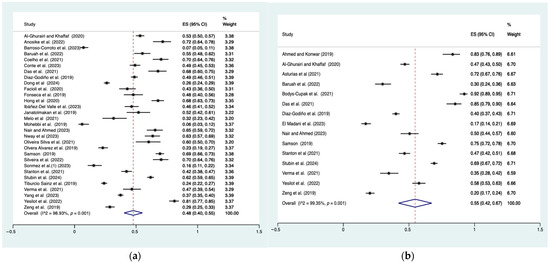 Prevalence of depressive symptoms and stress. (a) Prevalence of depressive symptoms (b) Prevalence of stress. Note: Pooled prevalence included 34 studies: [4,5,6,14,15,18,29,30,39,47,49,54,55,57,58,59,60,62,63,64,66,67,68,72,74,75,76,77,78,79,80,81,82,83]. Dots are the effect size (ES) for each study, with horizontal lines indicating the 95% CI. Diamonds at the bottom are the pooled effect size, with their width indicating the 95% CI. Vertical dashed line marks are the overall pooled estimate.