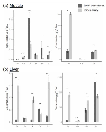 Metal concentrations (µg.g−1 DW) in muscle (a) and liver (b), for two fish populations (Seine and Douarnenez). (p-value following Kruskal-Wallis test: *: p-value < 0.05; **: p-value < 0.01; ***: p-value < 0.001).