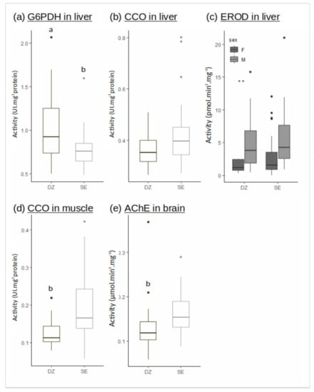 Enzymatic activities in liver ((a) G6PDH, (b) CCO, (c) EROD), muscle ((d) CCO), brain ((e) AChE) in the Douarnenez bay (DZ) and in the Seine estuary (SE). Letters indicate significant difference between mean flounder population of DZ and SE (Kruskal-Wallis test: p-value < 0.001). Two stars ** indicate a significant difference within the Douarnenez population (Kruskal-Wallis test: p-value < 0.01).