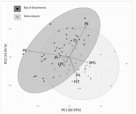 The distribution of membrane lipids and individuals was analysed in the two estuaries by a principal component analysis (PCA), with the main factorial plan (axes 1 and 2) explaining 76.98% of the total variance of the data set (Figure 4). The Seine fish were mainly segregated from those of Douarnenez by higher concentrations of FST-PS-SPG, lower concentrations of PC, and less variable levels of PE (Figure 4).