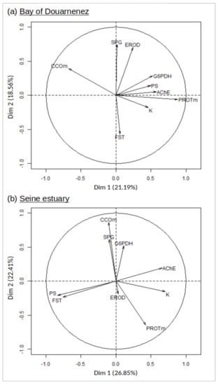 The two first axes of the PCA explained 44.75% and 49.26% of the total variance of the data set, respectively for Douarnenez and Seine populations (Figure 5). In the Douarnenez sample, a group of positively correlated variables (K-muscle protein-G6PDH-AChE-PS) was negatively correlated with CCO on the first axis, with the second axis showing a negative correlation between EROD-SPG and FST (Figure 5).