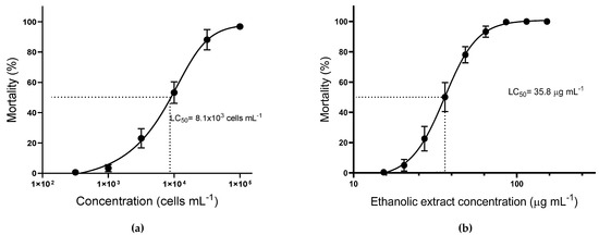 Mortality of Artemia salina nauplii after 24 h of incubation (mean ± sem; n = 3). (a) Treatment A, Artemia exposed to different A. operculatum cell densities; (b) Treatment D; Artemia exposed to different A. operculatum ethanolic extract dosages.