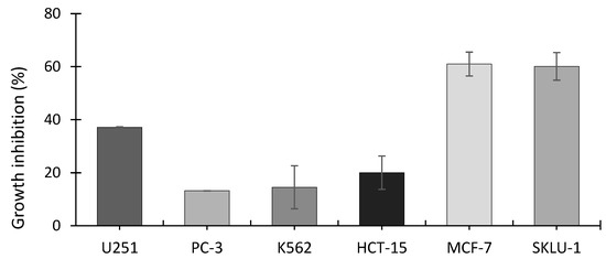 Growth inhibition of cell lines exposed to A. operculatum ethanolic extract at 24.7 μg mL−1 (equivalent to 5110 cells mL−1). Histograms show the mean ± sem (n = 3) of inhibition (%). Cell type: U251 (human glioblastoma); PC-3 (human prostatic adenocarcinoma); K562 (human erythroleukemia); HCT-15 (human colorectal adenocarcinoma); MCF-7 (human mammary adenocarcinoma); SKLU-1 (human lung adenocarcinoma).