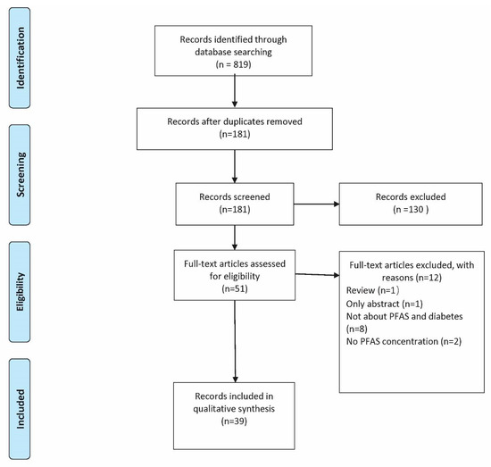The references of articles were also screened for potentially relevant studies. From the initial search, 819 articles were found. After removing duplicates, there were 181 articles to screen. After a full-text review, there were 41 articles included. A PRISMA flow chart showing selection and exclusion criteria is shown (Figure 1) [48,49]. From the searches, articles were screened by evaluating titles and abstracts. The full text was reviewed for 51 articles and 45 was included after review. Included studies were required to be (1) human and have a (2) form of diabetes tested for; we required (3) serum, blood, plasma, breast milk, or placental concentrations of PFAS. No limits were placed on publication year or study methodology.