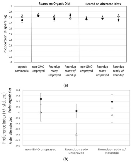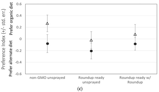 However, there was also no significant difference in preference index between any diet treatments (A, B, C, or organic) for either male or female flies, except that when reared on the organic diet, males were more likely than females to be found on the organic side of the T-maze, regardless of which medium was presented on the other side (Figure 1b; Table 1). There was also a non-significant tendency for males to be more likely than females to be found on the medium on which they were reared when reared on a diet containing non-organic corn (Figure 1c). It is also important to note that our GMO corn that was sprayed with Roundup® was tested for residual glyphosate and AMPA (the primary metabolite of glyphosate) and was found to contain a combined total of only 0.4 µg/L.