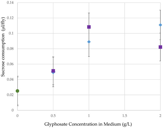 Female flies raised as adults on medium with high concentrations of glyphosate in Roundup later consumed more organic sucrose, resulting in a positive regression between glyphosate concentration in adult medium and sucrose consumption after 15–16 h of starvation (Figure 3; R2 = 17.8%, p = 0.001). No difference occurred between formulations (F = 0.0767, p = NS), so this factor was not considered in the overall regression analysis.