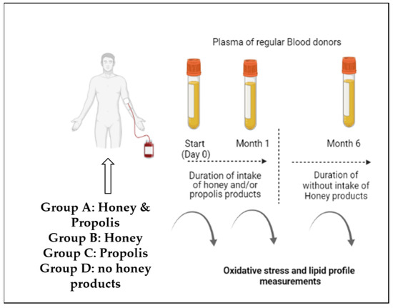 A pilot study (Figure 1) was carried out from January 2020 to December 2020 during the COVID-19 pandemic at the Blood Bank of the Naousa Hospital in Greece. The blood donors (n = 60) were comprised of 30 males aged 19–61 years and 30 females aged 21–64 years. Daily consumption of Greek honey (2 spoons) and propolis (1 drop) was performed among individuals in group A, only honey was consumed by blood donors (BDs) in group B, and only propolis was consumed by group C in the same dose.