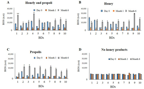 ROS levels (a.u) of selected blood donors (n = 10). (A) Group A, Greek honey and propolis; (B) group B, honey;(C) group C, propolis; and (D) group D; no honey products intake Data are the averages ± SDs of the 5 measurements. Significant differences from day 0 are represented as * p < 0.05 and ** p < 0.001.