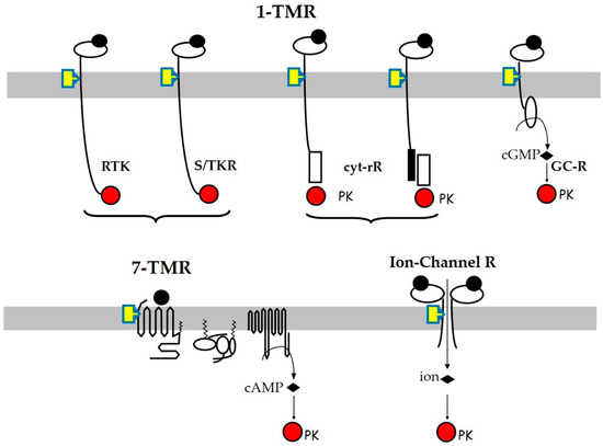 Schematic view of membrane receptor structures and their signaling pathways. The target cell plasma membranes are shown in grey, the finally impacted protein kinases (PK) in red, and the ligands as black dots occupying the receptor orthosteric sites. Most endocrine disruptors, which are hydrophobic molecules, mainly act through allosteric sites located in the transmembrane or juxta-membrane region(s) of the receptors, shown as yellow rectangles.