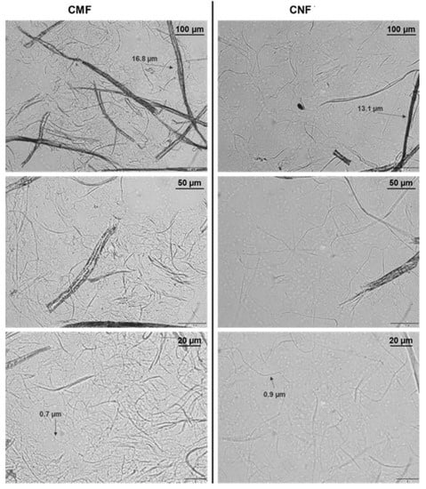 Bright-field microscopy images showed that CMF displayed non-fibrillated fibres together with differentiated fibrils with diameters near 1 µm and few smaller ones, which revealed diameters ranging 20 to 30 nm using FE-SEM. Concerning CNF, the number of fibrils with diameters of around 1 µm was much smaller, with most of the material being transformed into nanosized fibrils (Figure 1 and Figure 2). Nevertheless, FE-SEM of CNF and CMF did not allow the correct measure of the fibril’s diameter, particularly in the case of CNF due to the formation of an intricated nanofibre network (Figure 2), and TEM was used for all nanocelluloses under study (Figure 3).