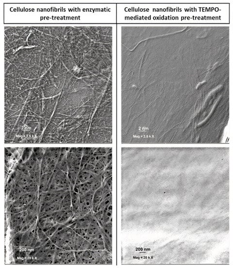 FE-SEM images of the two cellulose micro/nanofibrils obtained after enzymatic pre-treatment (CMF; left) and TEMPO-mediated oxidation (CNF; right) at different magnifications.