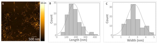 Example of an atomic force microscopy height image of CNC nanoparticles (A), and length (B) and width (C) distribution histograms obtained from AFM analysis.
