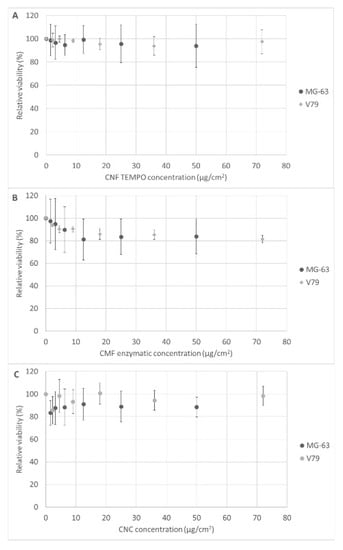 Cell viability relative to non-exposed control (MTT assay) after 24 h exposure to (A) TEMPO CNF, (B) enzymatic CMF, and (C) CNC, in MG-63 and V79 cells. Results are presented for each concentration tested as the mean ± SD of three independent experiments. Positive control (SDS 0.1%) yielded a relative viability that ranged from 1.7–8.1% in all experiments.