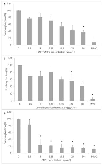 Results of the clonogenic assay after 17 h exposure to (A) TEMPO CNF, (B) enzymatic CMF, and (C) CNC in V79 cells, followed by 4 days resting. Results are presented as the mean ± SD of three independent experiments. MMC, mitomycin C. * p < 0.05.
