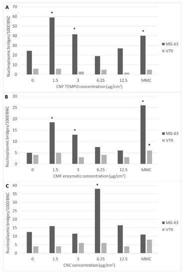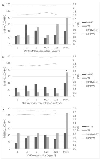 Frequency of binucleated cells (BNC) with nucleoplasmic bridges per 1000 BNC in MG-63 and V79 cells exposed to (A) TEMPO CNF, (B) enzymatic CMF, and (C) CNC. MMC, mitomycin C. * p < 0.05.