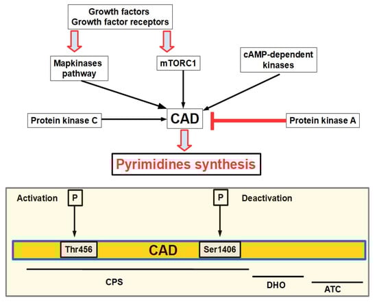 Pyrimidine nucleotides are essential building blocks not only for nucleic acid synthesis but DNA repair and other cell functions as well [19]. Pyrimidine biosynthesis is initiated and regulated by a multienzymatic complex, CAD (CPS-II, aspartate transcarbamoylase, and dihydroorotase), that harbors the enzymes required for the first three steps of biosynthesis. This association of enzymes in one big polypeptide is an unusual finding in superior eukaryotes. This explains the difficulties found in characterizing and defining the properties of each of the enzymatic domains in a separate manner. In addition, CAD self-assembles in hexameres. CAD, which controls the pathway, is in turn, controlled by pro-proliferation and pro-biosynthesis pathways (Figure 2).