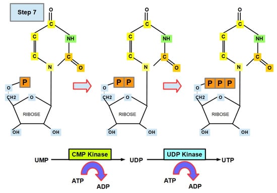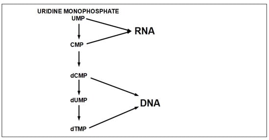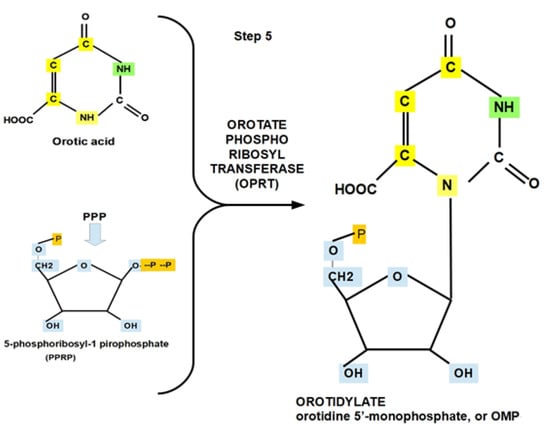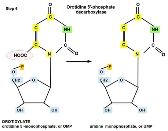 Orotidine 5′-monophosphate is converted to uridine monophosphate (UMP) by orotidine 5′-phosphate decarboxylase (OMP decarboxylase, ODCase). As a result, OPRT plus OMP decarboxylase form the bifunctional enzyme called uridine monophosphate synthetase (UMPS) (Figure 10) [98].