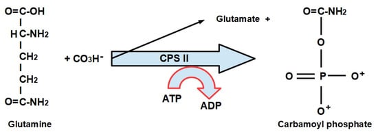 In the presence of ATP, L-glutamine and bicarbonate are converted to carbamoyl phosphate (CAP) by carbamoyl phosphate synthetase II (CPS-II) in the cytoplasm (Figure 4).