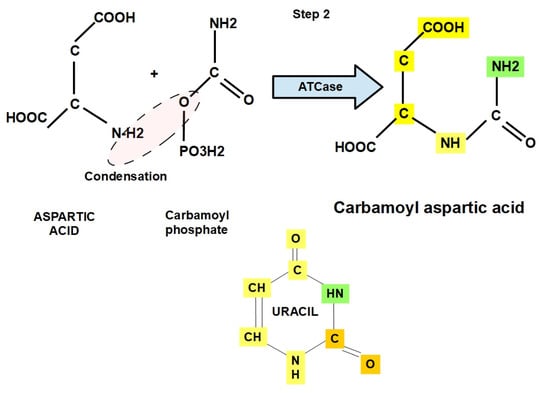 Condensation between aspartic acid and carbamoylphosphate, generating carbamoyl aspartate through the enzymatic action of ATCase (aspartate transcarbamoylase). The structure of uracil is shown in the lower panel for a comparative view of how this structure is being built.