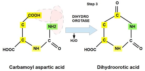 The carbamoyl phosphate (CAP) interacts with aspartic acid, generating carbamoyl aspartic acid (CAA) through condensation via aspartate transcarbamoylase (ATCase) (Figure 5).