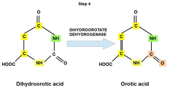 There are two dihydroorotate dehydrogenases, namely, class 1 (cytosolic) and class 2 (found in the inner mitochondrial membrane). In different organisms, dihydroorotate dehydrogenases use either NAD+, fumarate, or NADP+ as electron acceptors, yielding NADH, succinate, or NADPH, respectively [54,55,56,57,58]. Class 2 uses quinone as an electron acceptor, yielding hydroquinone [59,60,61,62,63] (Figure 7).