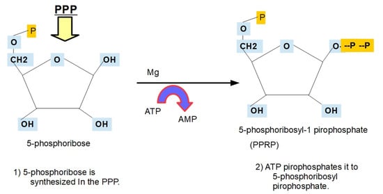 Phosphoribosyl pyrophosphate originates in the first part of the oxidative phase of the pentose phosphate pathway [85]. Therefore, this step of the pentose phosphate pathway (PPP) branches to merge and/or amalgamate with de novo pyrimidine biosynthesis. Interestingly, there is a shared regulation of the glycolytic and PPP pathways by intracellular pH pHi. Indeed, as with glycolysis, the optimal activity of the enzymes driving the PPP occurs at an alkaline pHi, which is compatible with the cytoplasmic pH of cancer cells (Figure 8 and Figure 9).