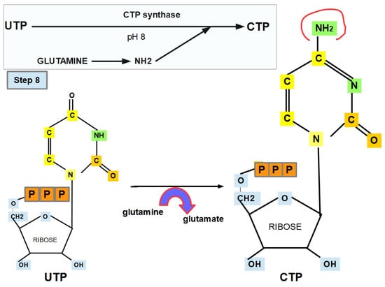 Figure 3 shows a full view of the de novo synthesis of pyrimidines from their origin in glutamine up to the pyrimidine uridine monophosphate. The diagram shows the origin of the different parts of a uracil molecule, which receives contributions from aspartic acid, glutamine, and CO2 (converted into HCO3− by cytoplasmic carbonic anhydrases). The major amino acid contributors are aspartic acid and glutamine. Each of them also donates an amino group. Glutamine contributes to an NH2 group (see right panel of Figure 3).