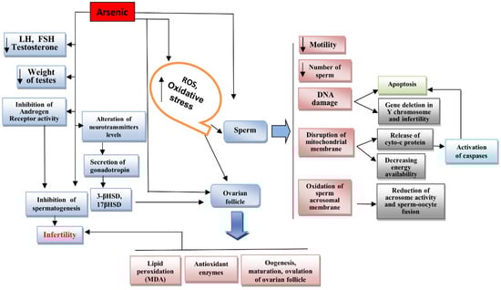 Infertility is not being able to become pregnant after one year or more of engaging in unprotected sex. Infertility affects millions of people of reproductive age worldwide and based on World Health Organization (WHO) reports, it is suggested that between 48 million couples and 186 million individuals suffer from infertility globally [1]. Medical studies have reported that 30% of infertile couples have unexplained infertility conditions after standard evaluations [2]. There are numerous reasons for the development of infertility in humans, and exposure to toxic heavy metals is considered one of the potential reasons. Humans are often exposed to individual or multiple heavy metals released from industrial activities into the environment. Within the last century, there has been a rapid growth in industrialization and technological advances across the world, which have contributed significantly to industrial pollution. Heavy metal pollution (i.e., arsenic, cadmium, mercury, titanium, iron, cobalt) is one of the industrial pollutions that is most prevalent in the environment. Arsenic is a well-known ubiquitous metalloid in the environment. Humans are mainly exposed to arsenic via contaminated drinking water and food. Arsenic is widely used in herbicides and insecticides for its known toxicological outcomes in invertebrates. Manifestations of arsenic toxicity in humans mainly depend on two factors: (I) the duration of the exposure and (II) the dose of the metalloid. Side effects associated with arsenic doses vary from fatality to cancers of the skin, bladder, liver, and kidney. Arsenic exposure has also contributed significantly to infertility and miscarriages in humans [3,4,5]. Findings from several epidemiological studies on menstruation indicate that exposure to heavy metals affects hormone levels in the human system [6]. There is very strong evidence that exposure to environmental levels of heavy metals interfere with the reproductive function in adult women [6,7]. Several epidemiological studies have evaluated blood levels of arsenic and other heavy metals in infertile women; among them, a notable investigation was conducted in China by Hsiao-Ling Lei et al., and the results showed that blood levels of arsenic were significantly higher in infertile women compared to pregnant women [8]. Several urinary biomarkers such as acylcarnitines, uridine (a stimulant of energy expenditure and apoptosis), and methyl xanthine have shown an association between arsenic-induced oxidative stress and infertility in men [9]. Numerous animal and human studies have shown that arsenic exposures induce infertility by altering the levels of follicle-stimulating hormone (FSH), luteinizing hormone (LH), and testosterone and may cause damage to the process of spermatogenesis and oogenesis [5,9]. Decreases in the fusion of egg–sperm [9], abnormalities in the shape of the sperm [6], disturbances of sperm capacitation [10], impairments in the glycolysis pathway [11], as well as disruptions in lipid and amino acids’ metabolism [12], are known adverse outcomes of arsenic for the male reproductive system. This review highlights the relationship between arsenic-induced oxidative stress and infertility.