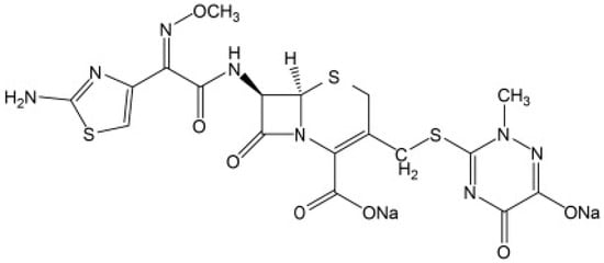 - Owens, H.M.; Dash, A.K. Ceftriaxone Sodium: Comprehensive Profile. Profiles Drug Subst. Excip. Relat. Methodol. 2003, 30, 21–57. [Google Scholar] [CrossRef]