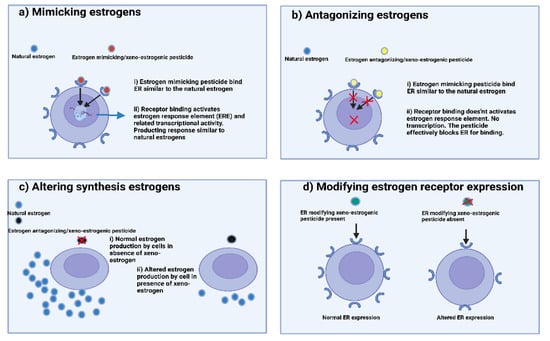 Different mechanisms of endocrine disruption by xeno-estrogenic pesticides: (a) mimicking estrogens, (b) antagonizing estrogens, (c) altering estrogen synthesis, and (d) modifying estrogen receptor expression.