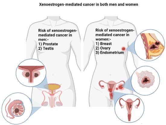In recent decades, “environmental xenobiotic-mediated endocrine disruption”, especially by xeno-estrogens, has gained a lot of interest from toxicologists and environmental researchers. These estrogen-mimicking chemicals are known to cause various human disorders. Pesticides are the most heavily used harmful xenobiotic chemicals around the world. The estrogen-mimicking potential of the most widely used organochlorine pesticides is well established. However, their effect is not as clearly understood among the plethora of effects these persistent xenobiotics are known to pose on our physiological system. Estrogens are one of the principal risk modifiers of various disorders, including cancer, not only in women but in men as well. Despite the ban on these xenobiotics in some parts of the world, humans are still at apparent risk of exposure to these harmful chemicals as they are still widely persistent and likely to stay in our environment for a long time owing to their high chemical stability. The present work intends to understand how these harmful chemicals may affect the risk of the development of estrogen-mediated human cancer.