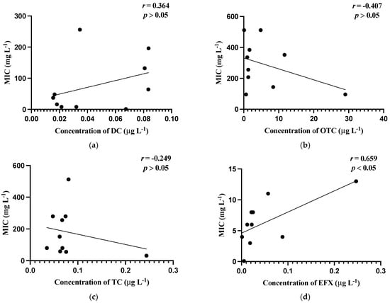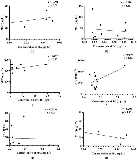 Correlations of minimum inhibitory concentrations (MICs, mg L−1) against the residual concentrations of antibiotics (µg L−1). (a) MIC (mg L−1) of Aeromonas spp. against concentration (µg L−1) of doxycycline; (b) MIC (mg L−1) of Aeromonas spp. against concentration (µg L−1) of oxytetracycline; (c) MIC (mg L−1) of Aeromonas spp. against concentration (µg L−1) of tetracycline; (d) MIC (mg L−1) of Aeromonas spp. against concentrations (µg L−1) of enrofloxacin; (e) MIC (mg L−1) of Aeromonas spp. against concentrations (µg L−1) of oxalinic acid; (f) MIC (mg L−1) of Pseudomonas spp. against concentrations (µg L−1) of doxycycline; (g) MIC (mg L−1) of Pseudomonas spp. against concentrations (µg L−1) of oxytetracycline; (h) MIC (mg L−1) of Pseudomonas s spp. against concentrations (µg L−1) of tetracycline; (i) MIC (mg L−1) of Pseudomonas spp. against concentrations (µg L−1) of enrofloxacin; (j) MIC (mg L−1) of Pseudomonas spp. against concentrations (µg L−1) of oxalinic acid.