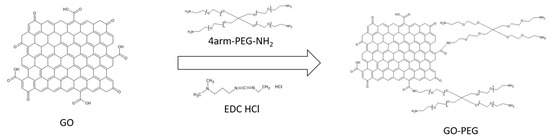 A dispersion of graphene nanomaterial of concentration 1 mg/mL (100 mg suspended in 100 mL of double-distilled water) is prepared, and then 4armPEG5K-NH2 (300 mg) is subsequently added. This mixture is sonicated in an ultrasonic bath for 5 min at room temperature. Afterwards, 30 mg of EDC HCl is added and sonicated in the ultrasonic bath for 40 min, after which EDC HCl (80 mg) is added again and left to stir overnight with magnetic stirring.