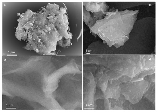 Structural characterization was performed by scanning electron microscopy to determine information about the size and shape of the nanostructures and test the possible morphological changes produced by the BSA interaction. Figure 2a–d shows the images of BSA, GO, GO-PEG and GO-PEG + BSA structures. The BSA has a shape similar to a cauliflower. Figure 2b,c show the images of GO and GO-PEG. These images present a sheet-like structure with a smooth surface, and in Figure 2d, the BSA is shown on the surface of GO-PEG.