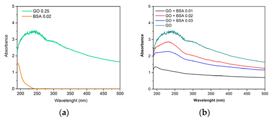 Obtaining the spectra of the nanomaterials allows us to know their characteristic patterns, so it is possible to compare and observe the variations when the protein is added. In the spectrum corresponding to GO (Figure 3a,b), two peaks characteristic of this nanomaterial are observed. There is a maximum peak at 230 nm corresponding with the π-π* transitions of aromatic C-C bonds, and a shoulder near 300–310 nm assigned to the n-π* transitions of C-O bonds [23]. The BSA addition is not remarkable in Figure 3b.