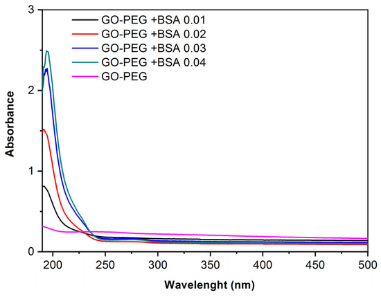 However, in the spectra with GO-PEG and different concentrations of BSA (Figure 4), it is observed that a peak is formed around 190 nm, which, as concentration increases, tends to move towards 210–220 nm, corresponding to the main structure of albumin. The small absorption shoulder formed around 280 nm corresponds to aromatic amino acids [25,26]. This demonstrates that PEG improves the dispersion of the samples because in Figure 4 the characteristic peaks of BSA are observed, whereas in Figure 3 using GO without PEG it is not possible to observe these peaks.
