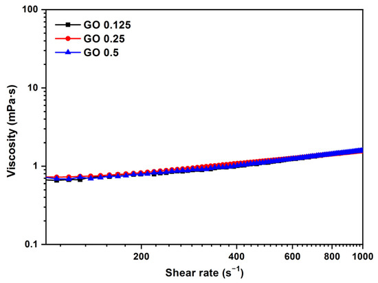 The viscosity curve as a function of shear rate for the GO sample at different concentrations (0.125–0.5 mg/mL) and temperatures of 37 °C can be seen in Figure 6. The samples exhibit the behavior of Newtonian flow. When the shear rate values are increased, there is a slight increase in the viscosity values. With liquids that have viscosity values of less than 3–4 mPa·s, is not a rotational rheometry appropriate because, at high shear rates, there is a strong effect of inertia and wall slippage that results in an apparent but false increase in viscosity in the high shear region. This effect was observed in previous studies by Cerpa et al. and Carnicer et al. [20,27], where the Newtonian behavior of these types of dispersions was also determined by a microfluidic rheometer at higher shear rates; thus, the apparent shear thickening obtained with rotational rheometry is an artifact of the measurement, because the values are within the detection limit of the apparatus and not real behavior [20,27].