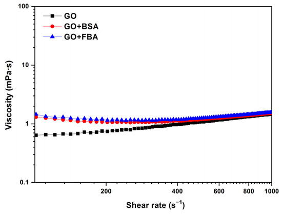The effect of the biological fluid is shown in Figure 7. This work compares the GO samples with BSA and FBS, using GO at 0.25 mg/mL, BSA at 0.02 mg/mL, and FBS 0.2 mg/mL, all at 37 °C. The viscosity curve of the GO + BSA and GO + FBS shows a viscosity value higher than for GO dispersions between 0 and 500 s−1 due to the interactions and aggregation that can occur between the GO, BSA, and other components of the biological medium. The viscosity value is 1.3 mPa·s for GO + BSA and GO + FBS samples and 0.7 mPa·s for GO at 200 s−1. The mean viscosity values of 1.1 mPa·s, 1.2 mPa·s, and 1.25 mPa·s for GO, GO + BSA, and GO + FBS, respectively, at 500 s−1, are obtained.