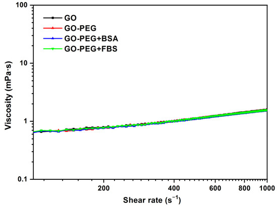 Viscosity (η) vs. shear rate () for 0.125 mg/mL dispersions of GO, GO-PEG, GO-PEG + BSA, and GO-PEG + FBS. Temperature: 37 °C.