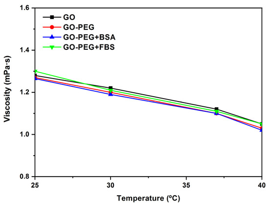 In Figure 10, the viscosity vs. temperature of GO, GO-PEG, GO-PEG + BSA, and GO-PEG + FBS dispersions at a concentration of 0.125 mg/mL and shear rate = 500 s−1 are shown. When the temperature increases, the viscosity values decrease. These values are between 1.3 and 1.1 mPa·s at a shear rate = 500 s−1 for all samples studied.