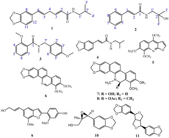 The aforementioned negative side effects of these medications have prompted researchers to look for alternate treatments with fewer severe drawbacks, especially those derived from natural drug reservoirs such as the metabolites of medicinal plants. In order to alleviate ailments and ease human suffering, herbal medicines and natural products have been employed as a source of medicine for a long time. As a result, interest in phytomedicine is rising; plant extracts have the potential to be safer, are more readily available, are less expensive, and have fewer negative side effects than synthetic antihyperglycemic medications [8]. However, the scope of discovering novel natural compounds with pharmacological importance in order to control type II diabetic mellitus (T2DM) is still constrained owing to the lack of a sufficient mechanism-based comprehensive investigation of these phytopharmaceuticals. Following the application of the root bark and stem of Z. chalybeum Engl. (Rutaceae) by traditional healers, a thorough bioassay investigation showed the extracts have an antihyperglycemic potential against streptozotocin- and alloxan-induced diabetic rats [9,10,11]. Subsequently, bioactivity-guided isolation resulted in the identification of some of the bioactive compounds including chaylbemide A (1), chalybemide B (2) and chalybemide C (3), fagaramide (4); skimmianine (5), norchelerythrine (6), 6-acetonyldihydrochelerythrine (7) and 6-hydroxy-N-methyldecarine (8), ailanthoidol (9), 2,3-epoxy-6,7-methylenedioxyconiferol (10) and sesamine (11) with the structures shown in Figure 1. These compounds have been shown to inhibit the enzymes α-glycosidase and α-amylase with IC50 values between 43.22 and 49.36 μM at comparable levels to (p > 0.05) the positive control acarbose which has IC50 values of 42.67 and 44.88 μM against α-amylase and α-glycosidase, respectively [12]. Such results established the ability of Z. chalybuem against DM; however, the study failed to establish the possible mechanism of interaction between the enzymes and the inhibitors (compounds), thus necessitating further investigation on the mode of actions via inhibition kinetics and molecular interaction studies.