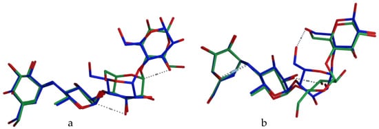 Superposed structures of acarbose after validation of the binding mode as obtained using the MOE software: in blue, the crystallographic pose; in green, the top-ranked docking pose. (a) α-glucosidase (PDB ID: 2QMJ); (b) α-Amylase (PDB ID: 7TAA).
