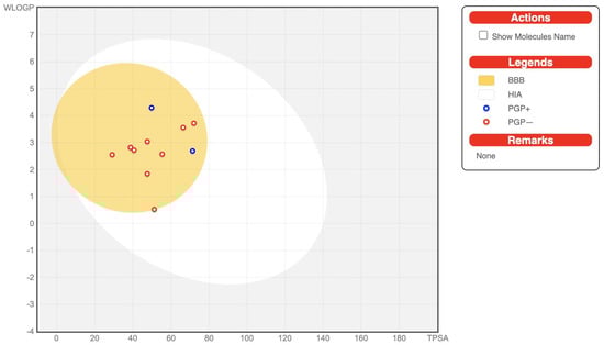 These compounds including the reference were predicted to have no permeation across the blood–brain barrier (BBB). The BBB penetration is calculated as the proportion of drug concentration levels in the brain and blood [39]. The predicted plasma protein binding (PPB) values indicated that the molecules are variedly bound to the protein plasma with values ranging from 40.15–90.55%. However, acarbose is bound to a low extent to the plasma protein. Only the unbound drug is typically available for permeation across cell membranes in order to reach the pharmacological target and elicit the desired activity [40]. Therefore, this property can not be emphasized enough. The Caco-2 (human colon carcinoma cell line) penetrability for the estimation of orally administered drug absorption of compounds 1–11 ranged from 24.39 to 57.03% with the reference, acarbose, showing no permeation through the Caco-2 cell membrane. This implied that these compounds can be administered orally, with considerable permeation across cell membranes. The transdermal efficacy of these molecules as demonstrated by their skin permeability including the reference indicates that they cannot penetrate through the skin except for compound 2. It is reported that drugs with logKp values higher than −2.5 cm/h will not penetrate through the skin with ease [41]. The BOILED-Egg plot between WLOGP and TPSA to predict gastrointestinal absorption and brain penetration of the selected molecules is shown in Figure 3. It can be seen from the plot that the molecules are predicted to possess BBB permeant properties and considerable GI absorption.